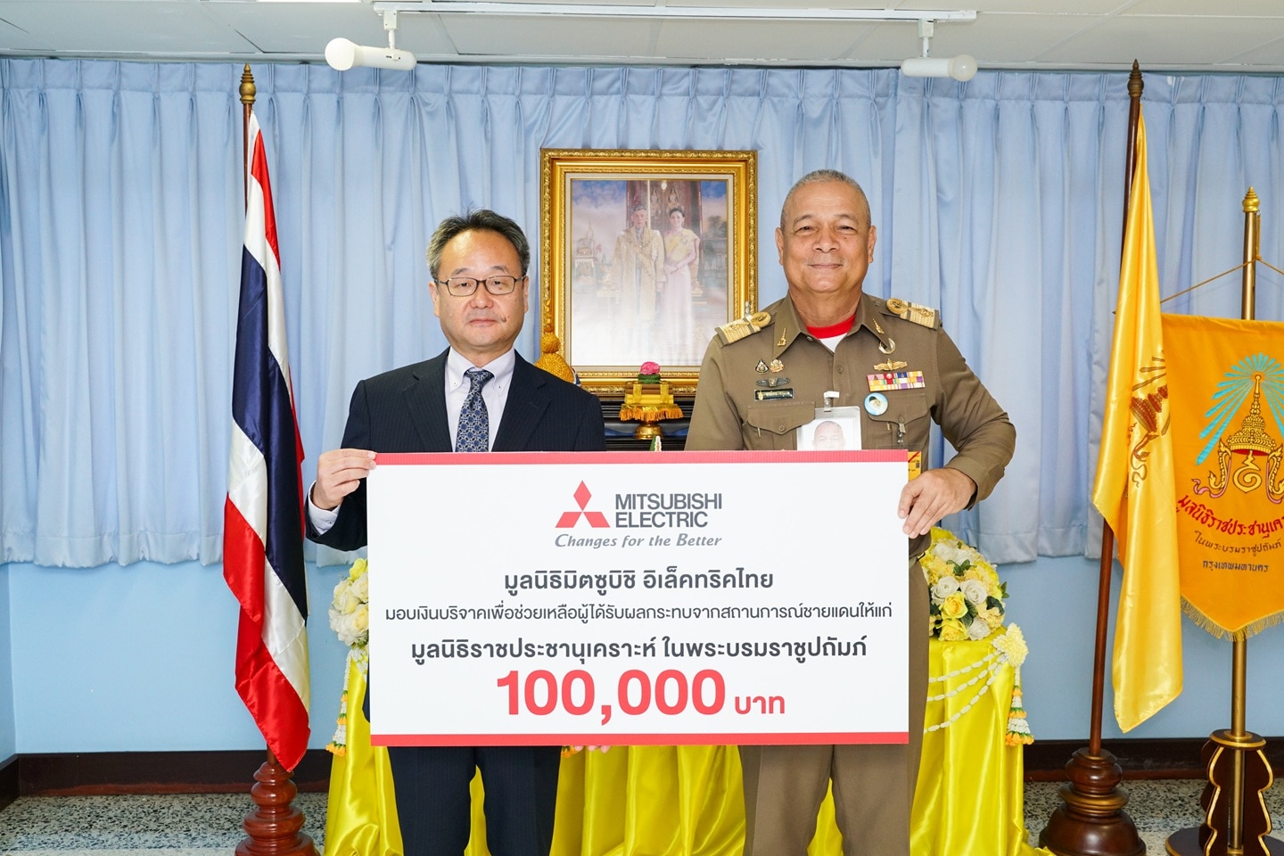 มูลนิธิมิตซูบิชิ อิเล็คทริคไทย โดย นายชินจิ เทะระทานิ รองประธานกรรมการ น้อมเกล้าฯ ถวายเงินโดยเสด็จพระราชกุศล จำนวน 100,000 บาท แก่ มูลนิธิราชประชานุเคราะห์ ในพระบรมราชูปถัมภ์ โดยมีวัตถุประสงค์เพื่อสนับสนุนและเยียวยาผู้ได้รับผลกระทบจากสถานการณ์ชายแดนไทย-กัมพูชา รวมถึงแสดงความเสียใจอย่างสุดซึ้งต่อทหารที่กล้าหาญเสียสละเพื่อประเทศชาติและครอบครัวที่สูญเสียผู้เป็นที่รักจากเหตุการณ์ครั้งนี้ เราพร้อมจะยืนหยัดร่วมกับสังคมไทยด้วยความหวังจากใจเพื่อความสันติสุขที่ยั่งยืน ในโอกาสนี้ พลเรือเอก พงษ์เทพ หนูเทพ ประธานกรรมการบริหาร มูลนิธิราชประชานุเคราะห์ฯ ให้เกียรติเป็นประธานในพิธีรับมอบ ณ มูลนิธิราชประชานุเคราะห์ ในพระบรมราชูปถัมภ์ โดยมีคณะผู้บริหารของ มูลนิธิมิตซูบิชิ อิเล็คทริคไทย เข้าร่วมในพิธี เพื่อแสดงถึงความมุ่งมั่นในการสนับสนุนกิจกรรมเพื่อสังคม